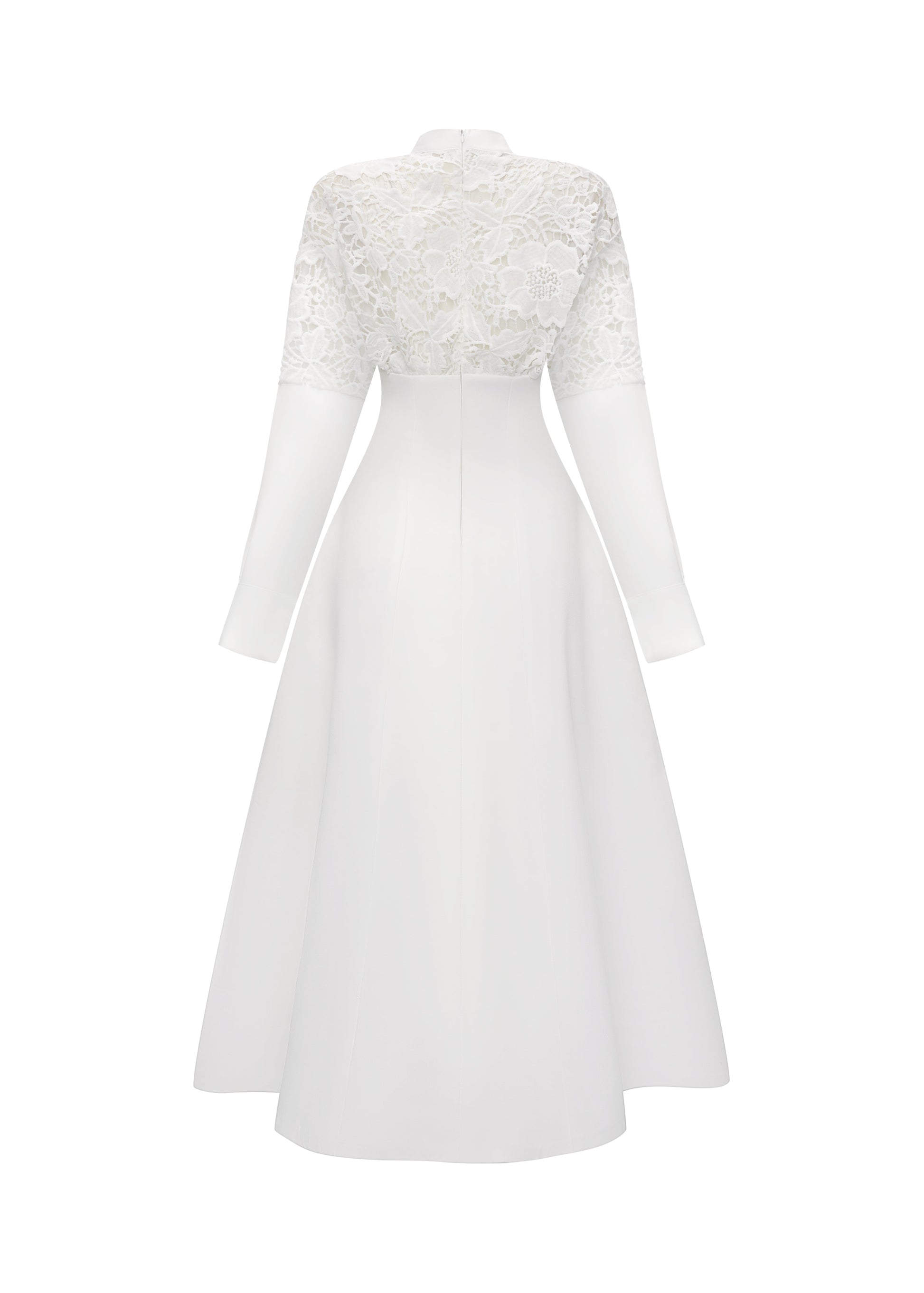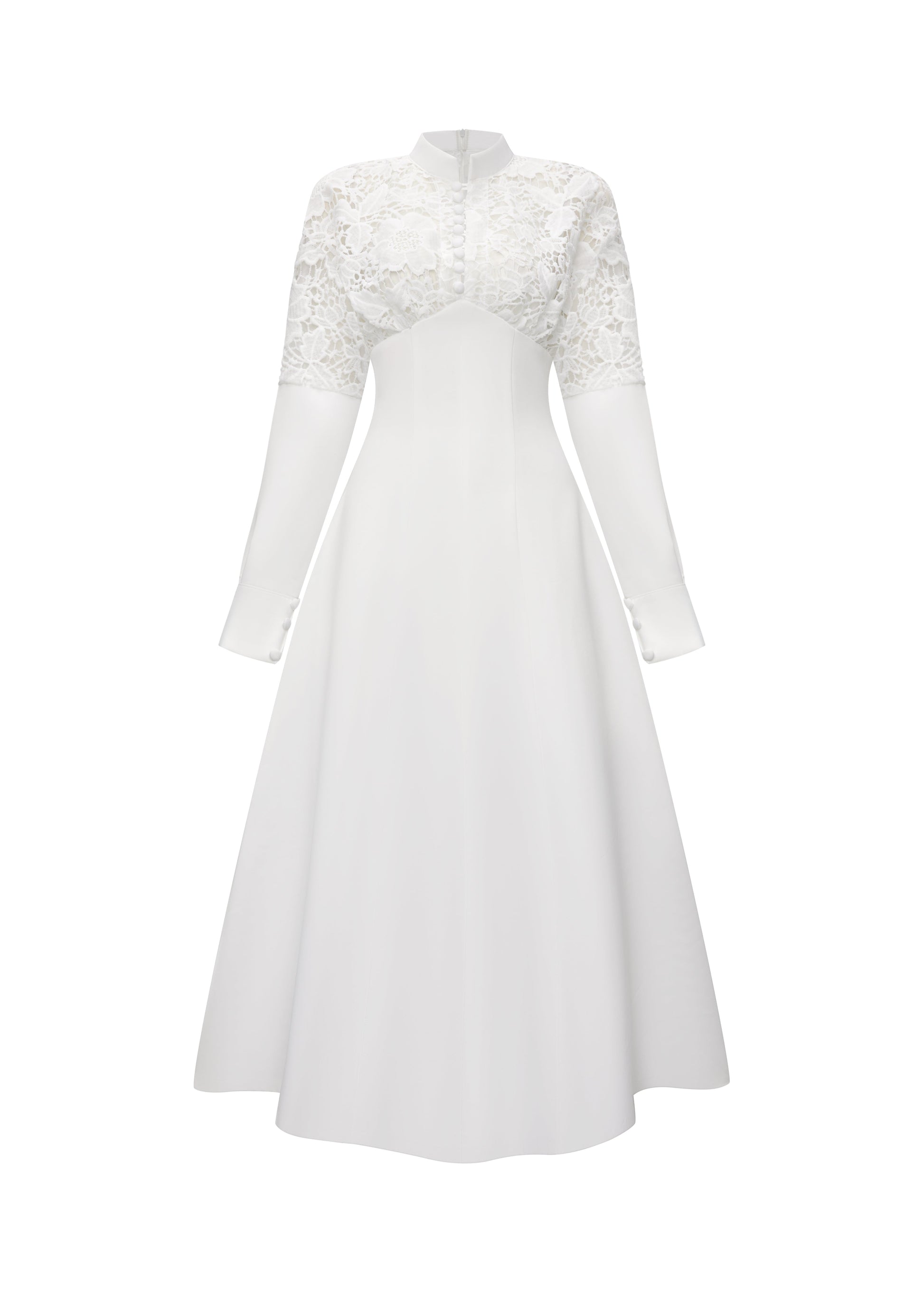 Delicate lace long sleeves add a romantic, airy contrast to the structured bodice, creating a balance that feels both poised and effortless. The flared bottom flows gently with each step, echoing the natural movement of petals in a light breeze and lending the silhouette a sense of calm sophistication.