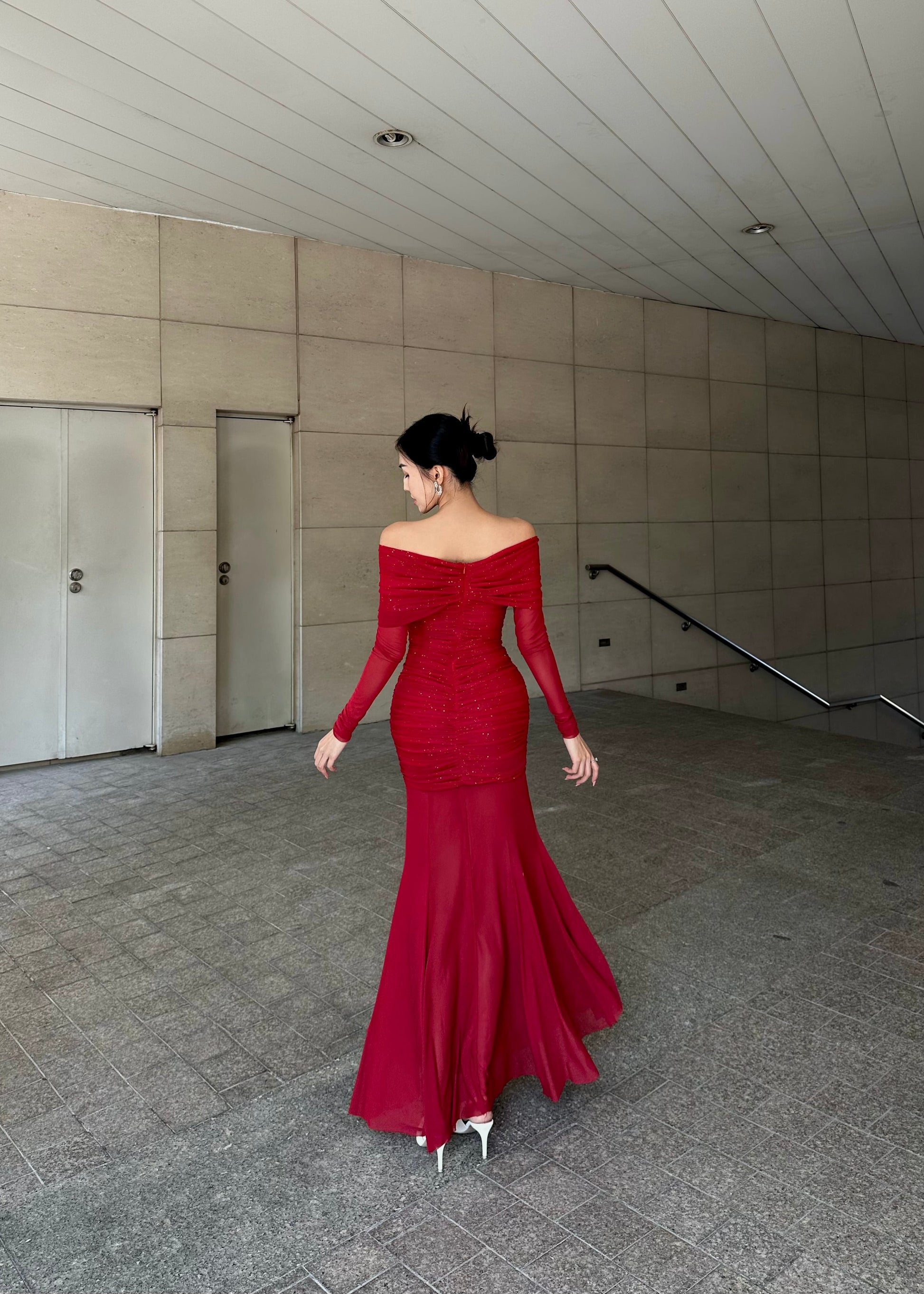 The Luminous Bow Maxi Dress unfolds like a quiet crimson evening, where nature’s drama meets refined luxury. Drenched in a deep red hue with a soft sparkle scattered across the fabric, the dress captures light like stardust settling on a twilight sky.