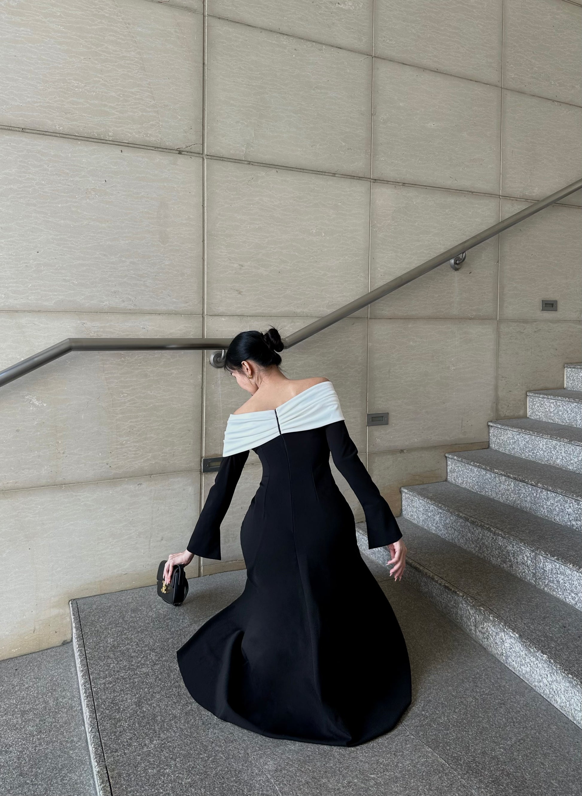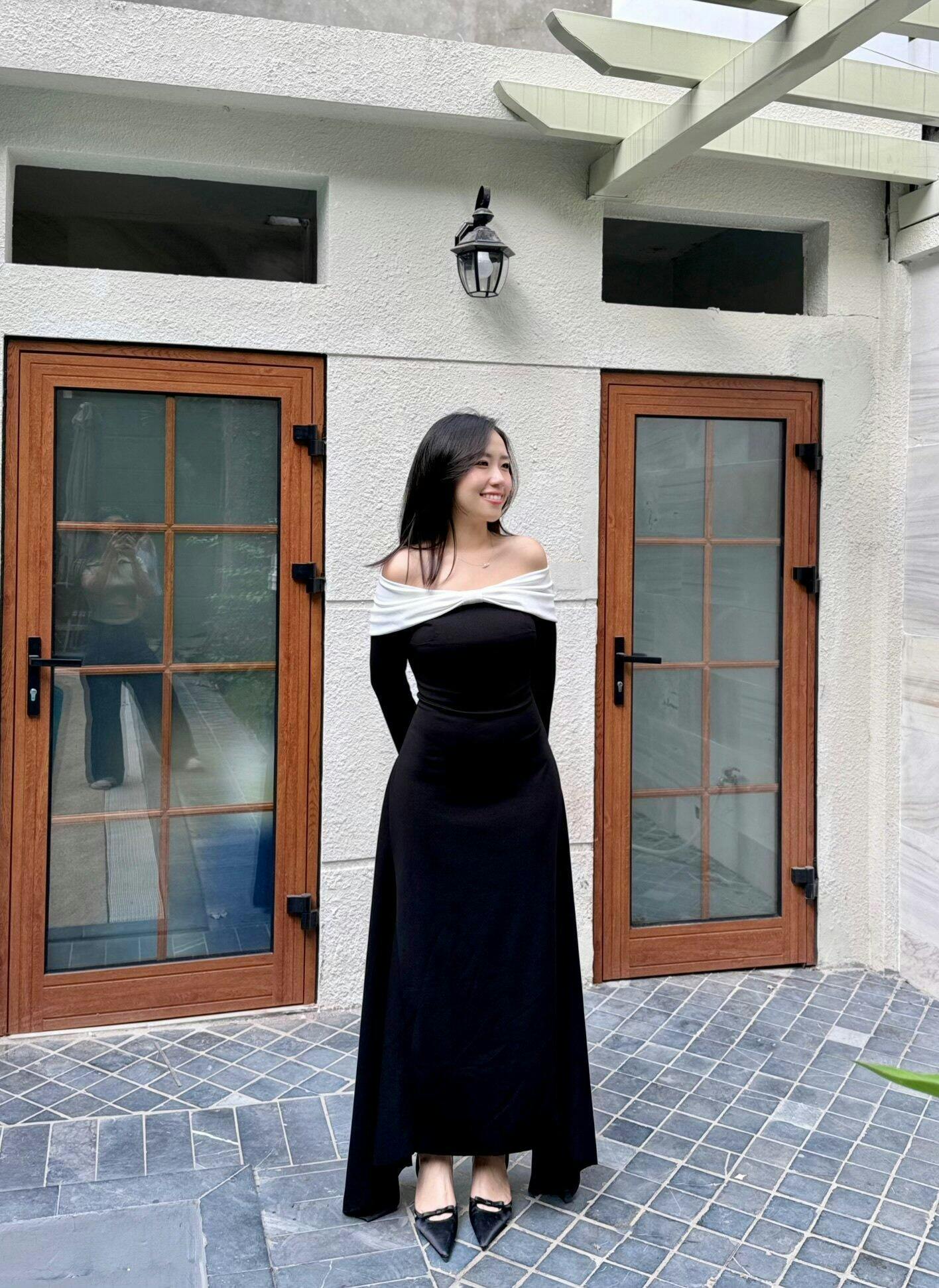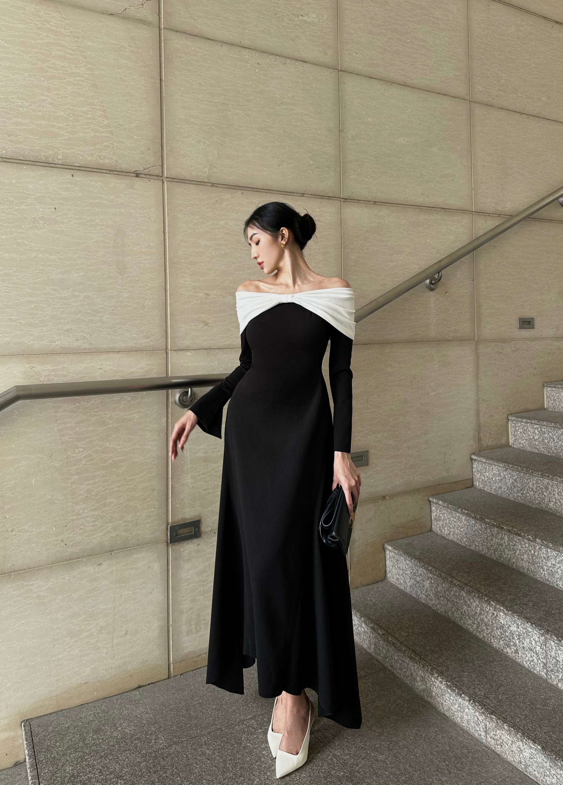 The off-shoulder neckline is crowned with a sculptural white bow, reminiscent of soft petals resting on vibrant blooms. This delicate contrast adds a poetic softness to the design, drawing the eye while framing the shoulders with effortless sophistication. The long, fluid lines of the midi length fall naturally, moving with gentle ease like leaves stirred by a calm evening breeze.