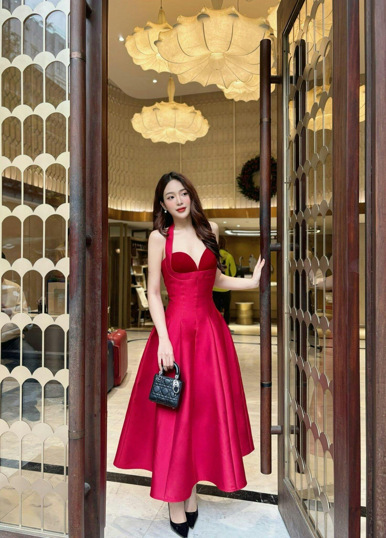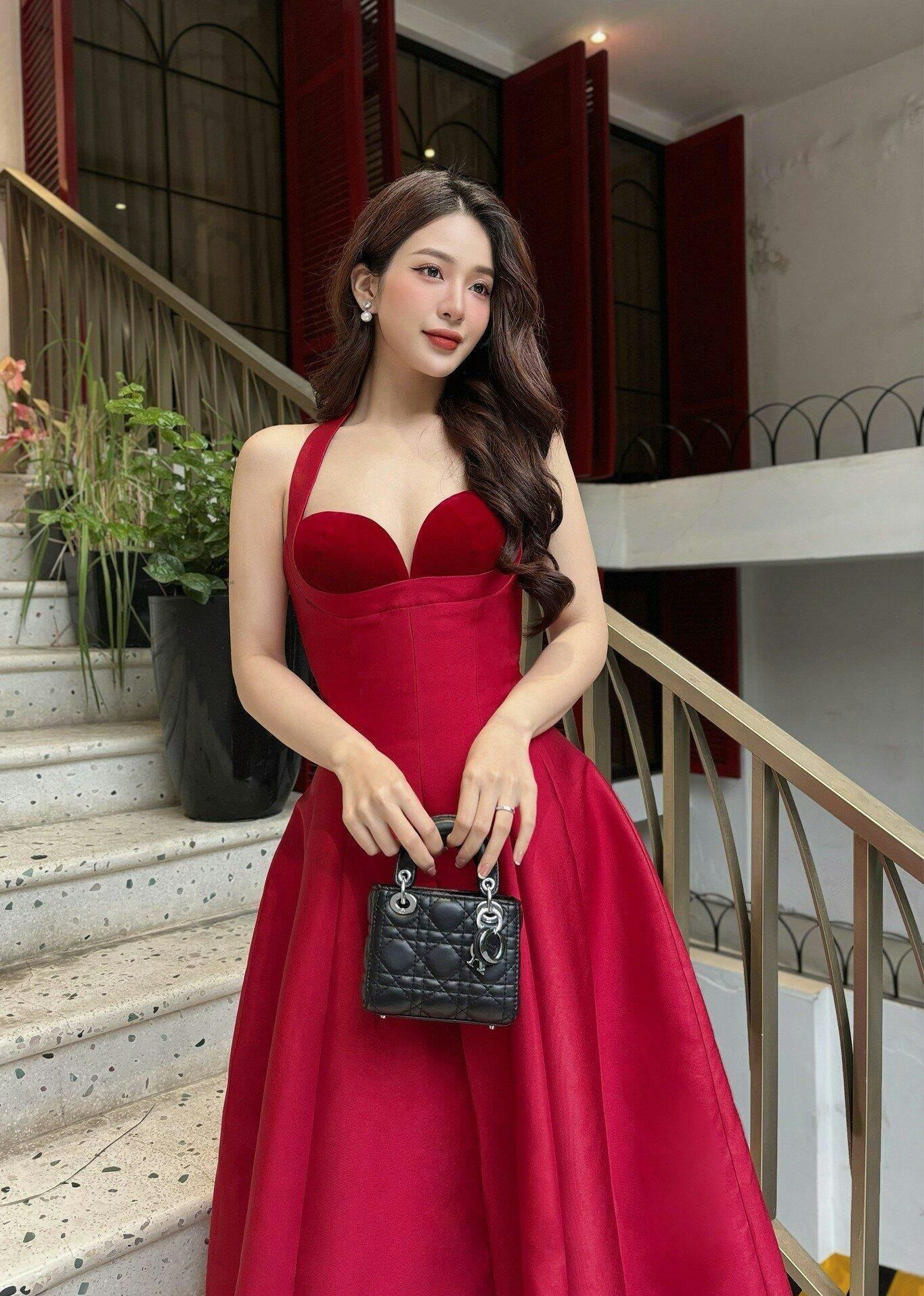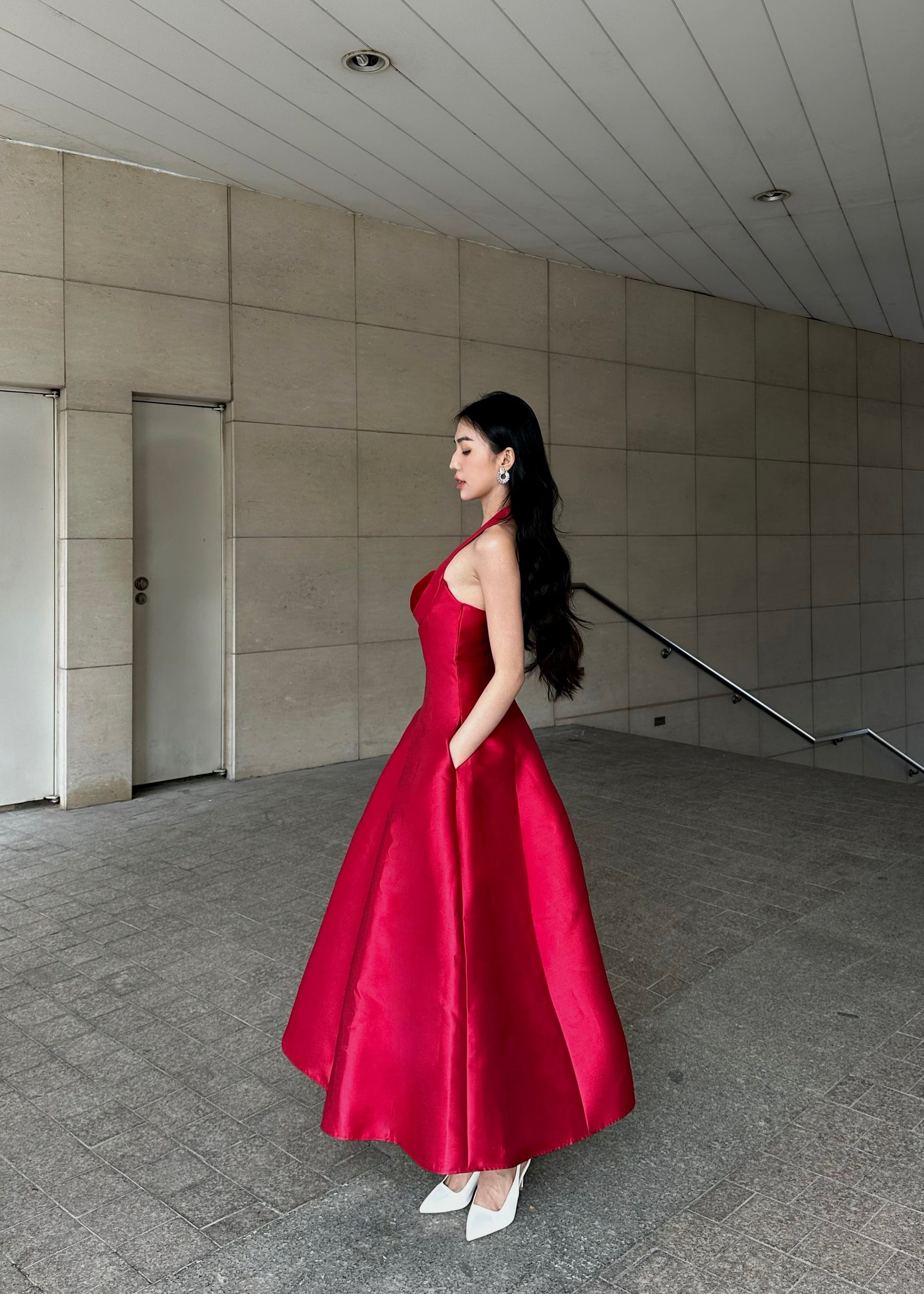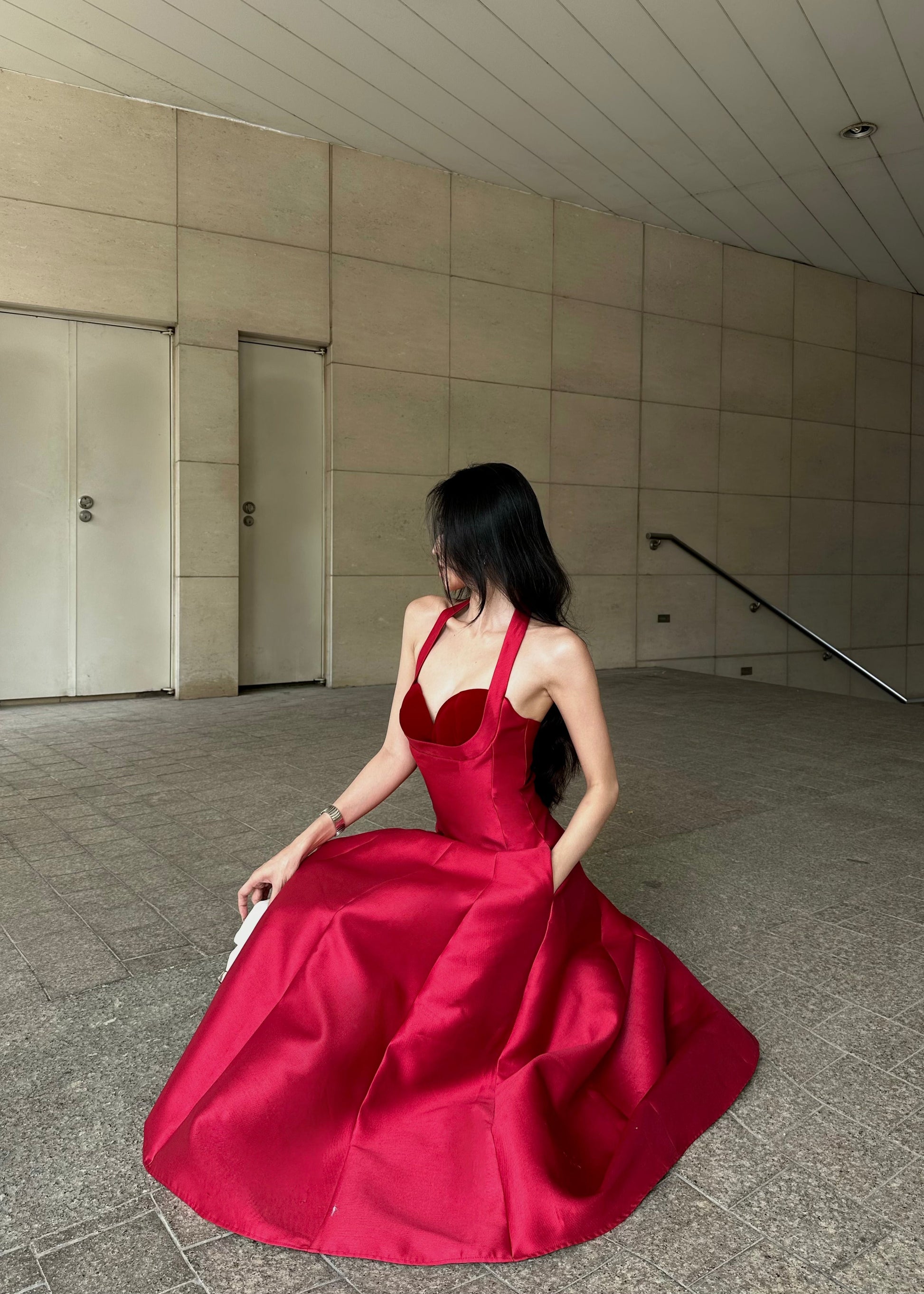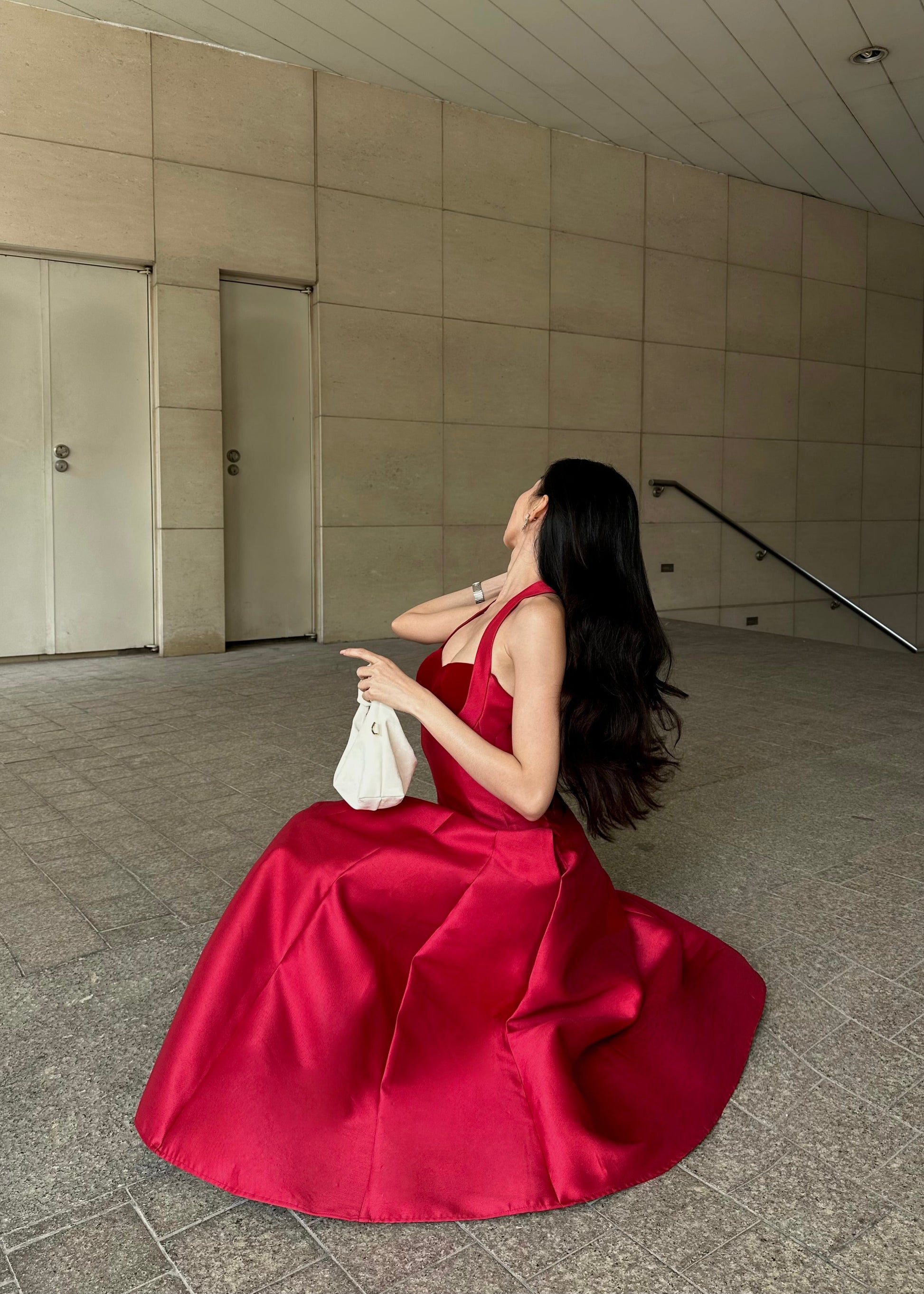 The Scarlett Strap Midi Dress is draped in a deep scarlet tone, the fabric glows softly as it catches the light, evoking warmth, passion, and timeless luxury.
