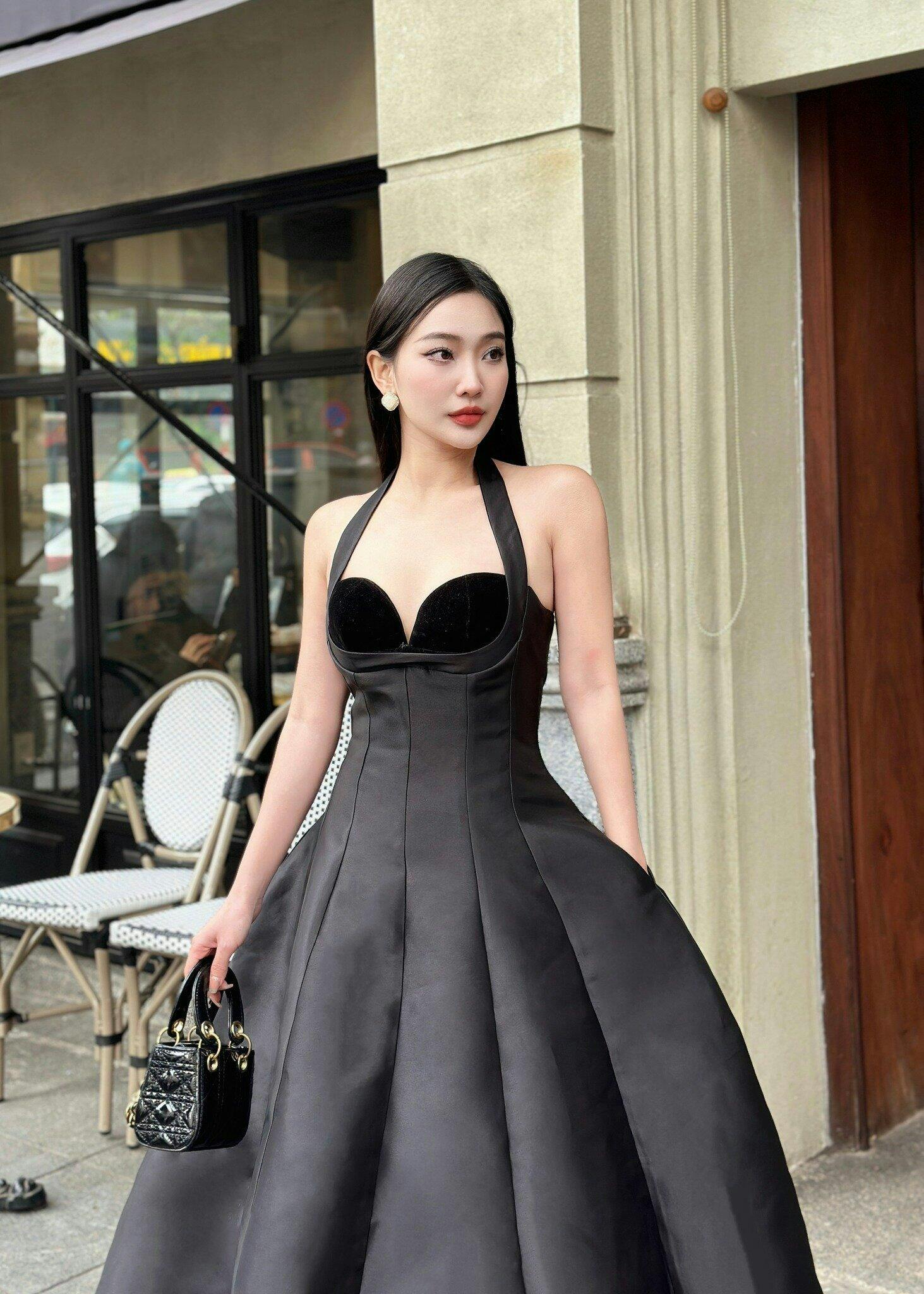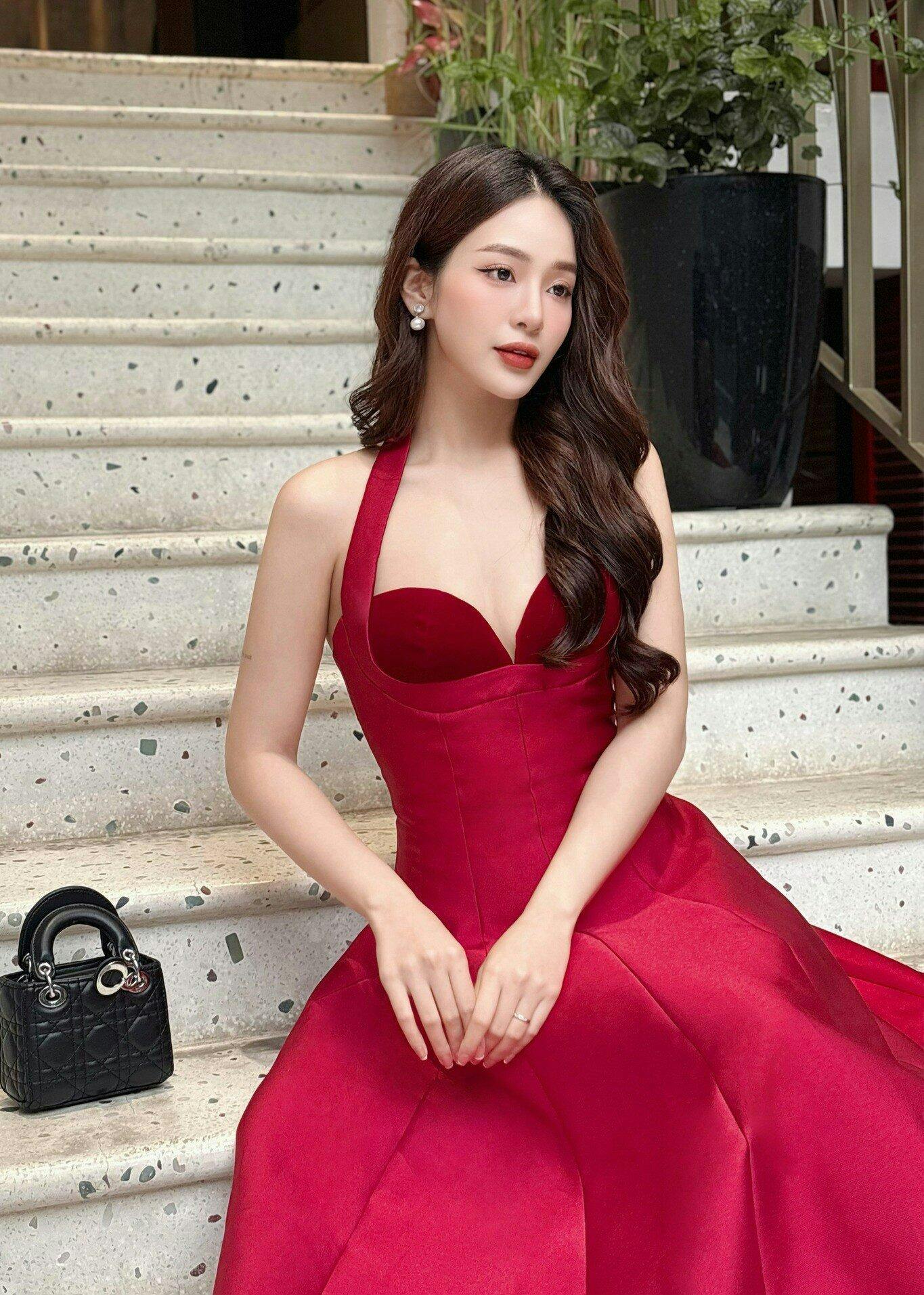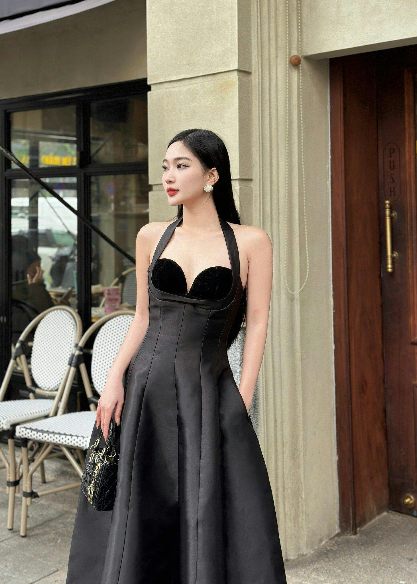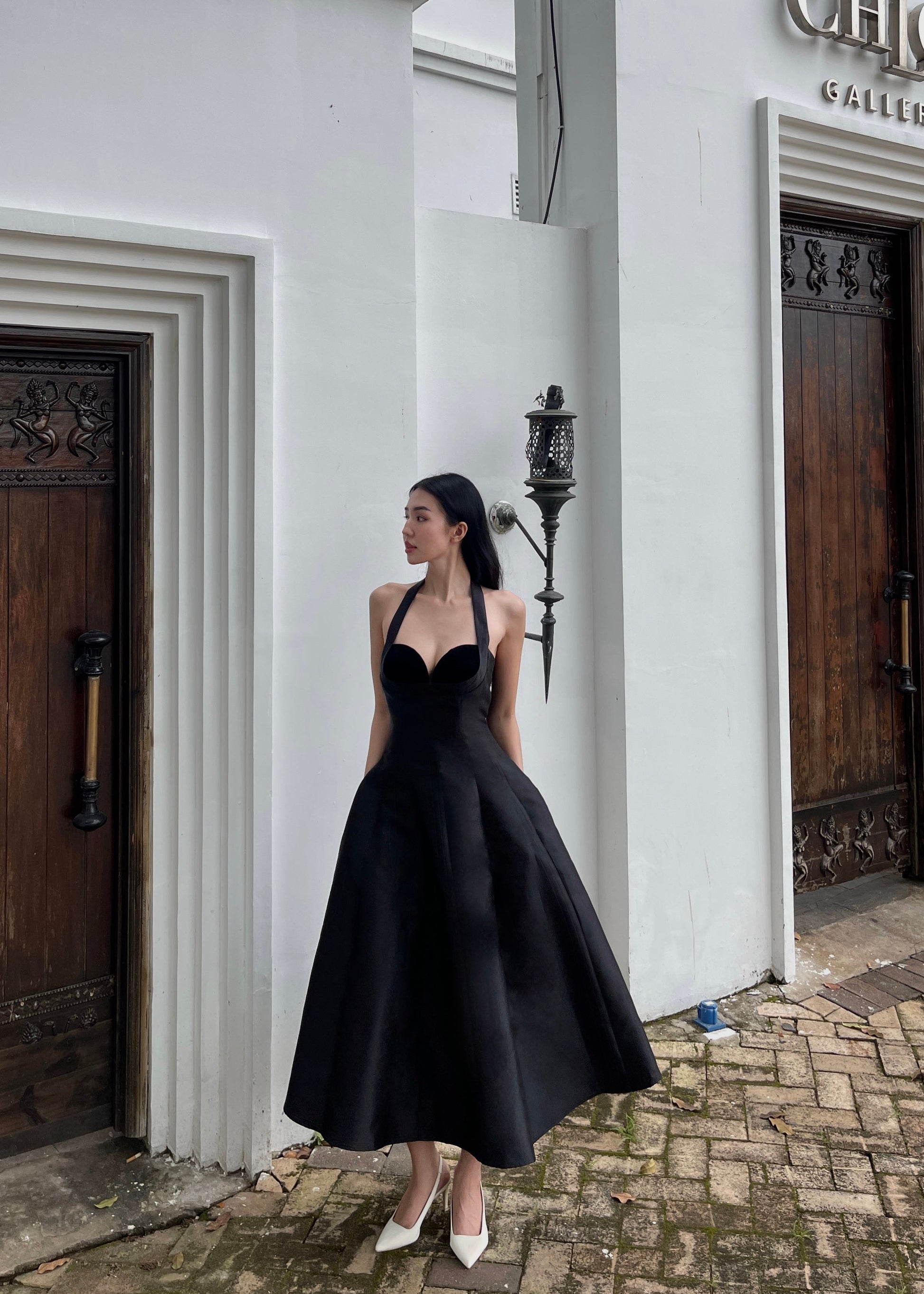 The sculpted bodice is delicately framed by graceful straps, offering both support and refined femininity. Flowing seamlessly into a gently flared midi skirt, the silhouette moves like a quiet breeze through silk petals-fluid, balanced, and effortlessly poised.