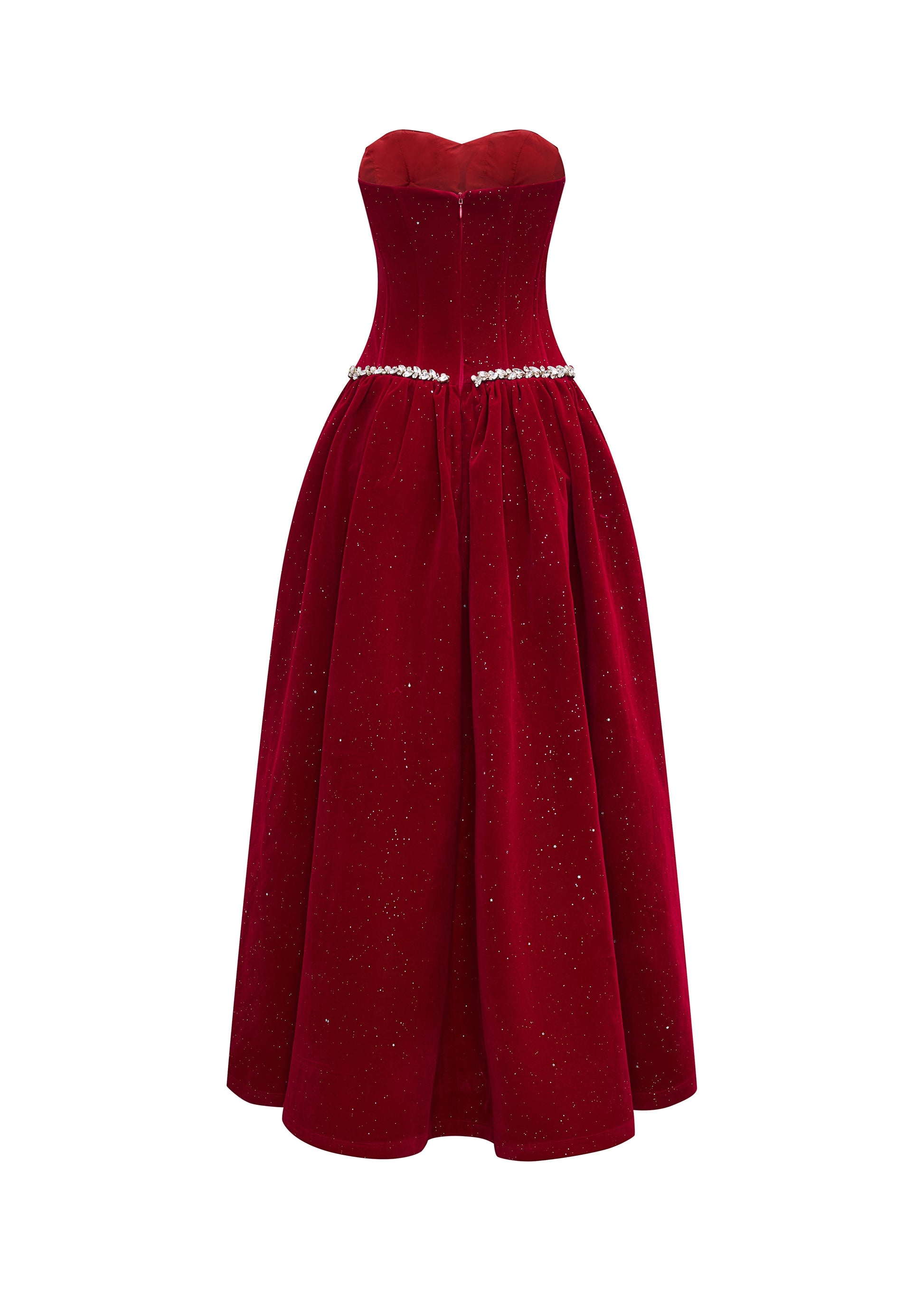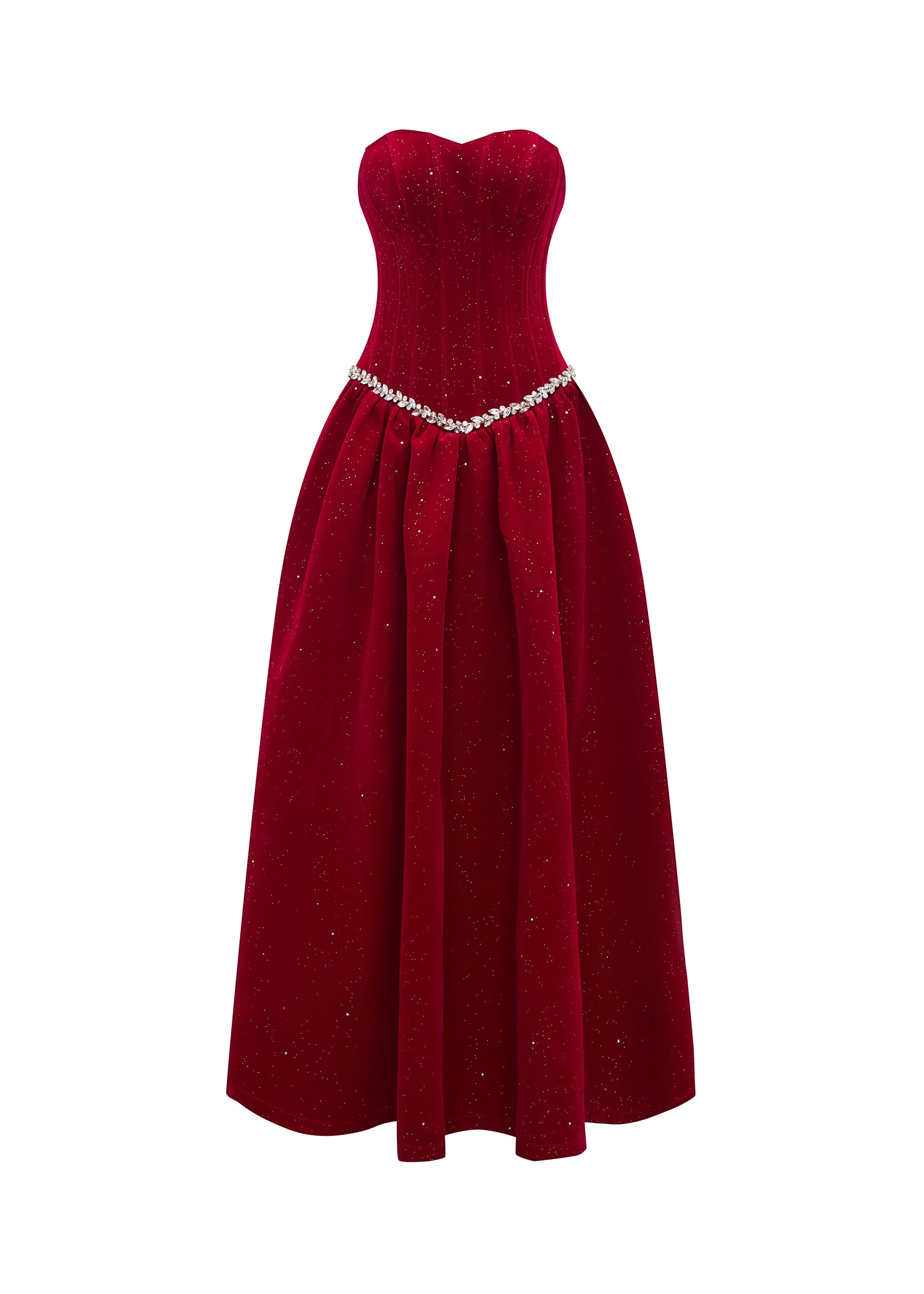 The strapless, sculpted bodice contours the silhouette with refined structure, while the gently flared skirt flows effortlessly, creating a graceful balance between drama and ease. A delicate crystal-embellished waistline catches the light like frost on holiday berries, adding a refined touch of luxury without excess.