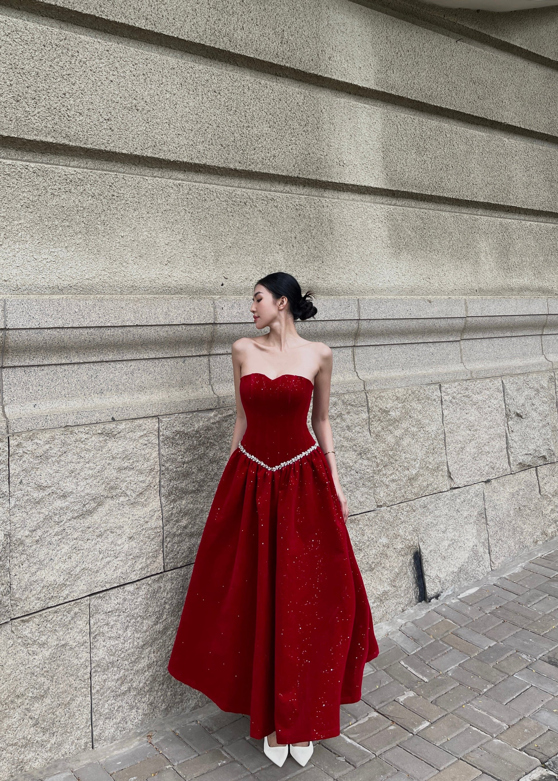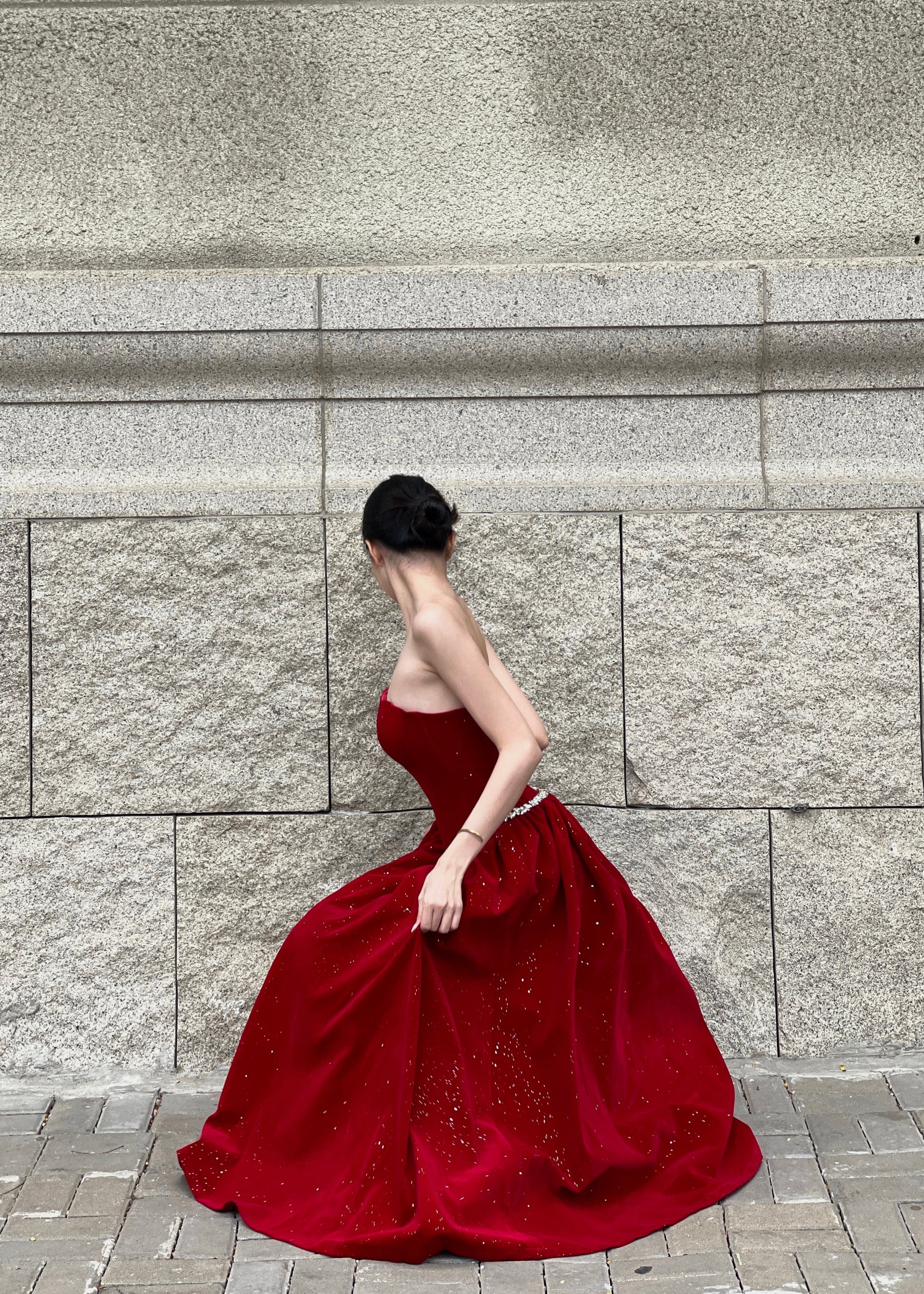 Indulge in a vision of timeless elegance with this red velvet dress, designed to capture the magic of the season. Crafted from plush velvet with a subtle sparkle woven throughout, it glows softly with every movement, evoking the warmth and romance of a winter evening.